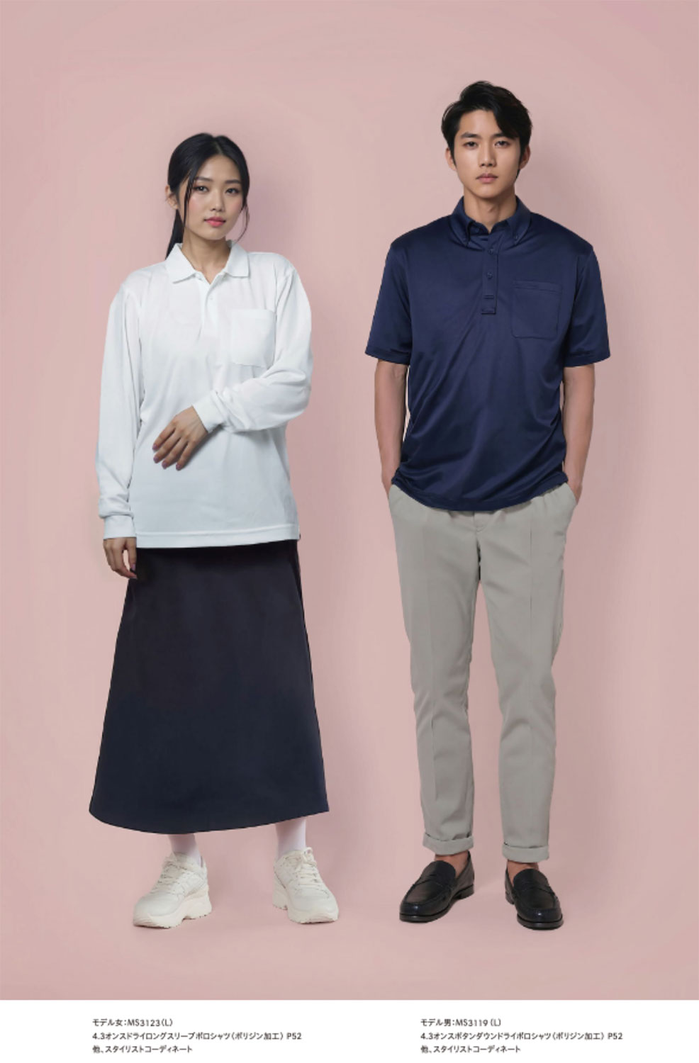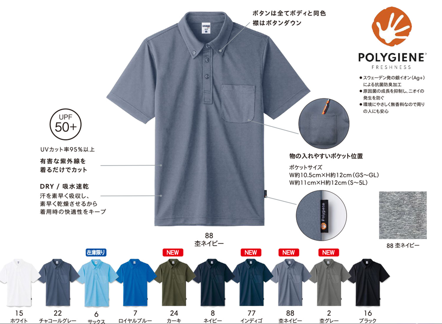高機能ドライ素材に、ポリジン加工を施した抗菌防臭の優れたポロシャツ。