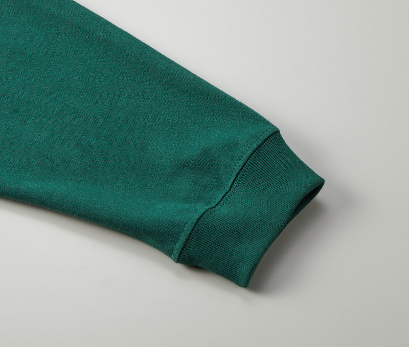 裾はあえてラウンドではなくスクエアにしたことで今っぽいボックスシルエットを演出した一方、バインダー始末の襟リブやラグランの袖まわりなど「これぞオーセンティック」といった主張も欠かさない一枚。