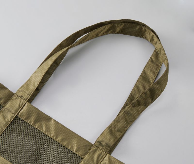 リップストップ生地と、メッシュの組み合わせ、肩掛けしやすい長さのハンドルがデイリーユースにぴったりのトートバッグです。