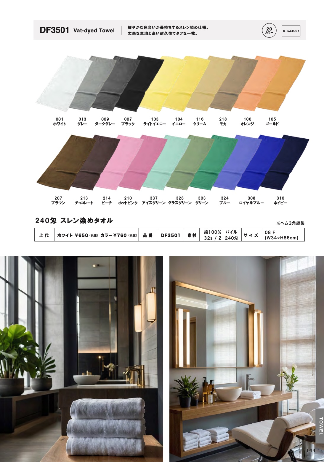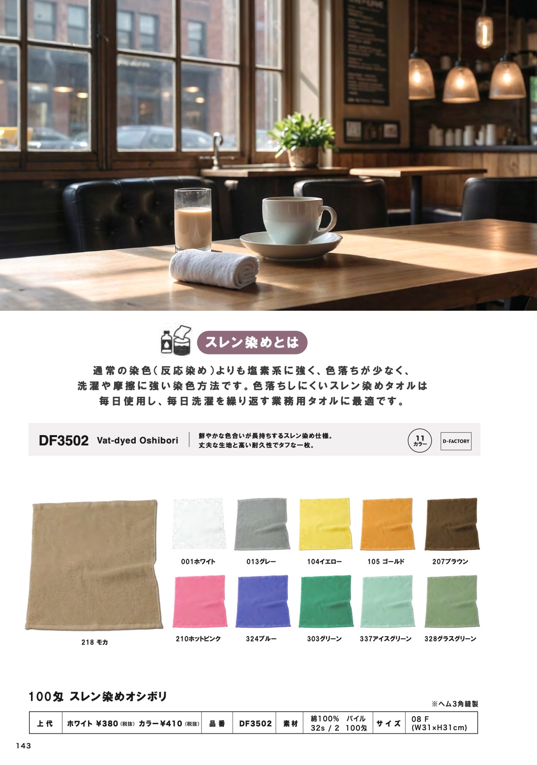 色落ちしにくいスレン染めタオルは、毎日使用し毎日洗濯を繰り返す業務用タオルにも最適です。
