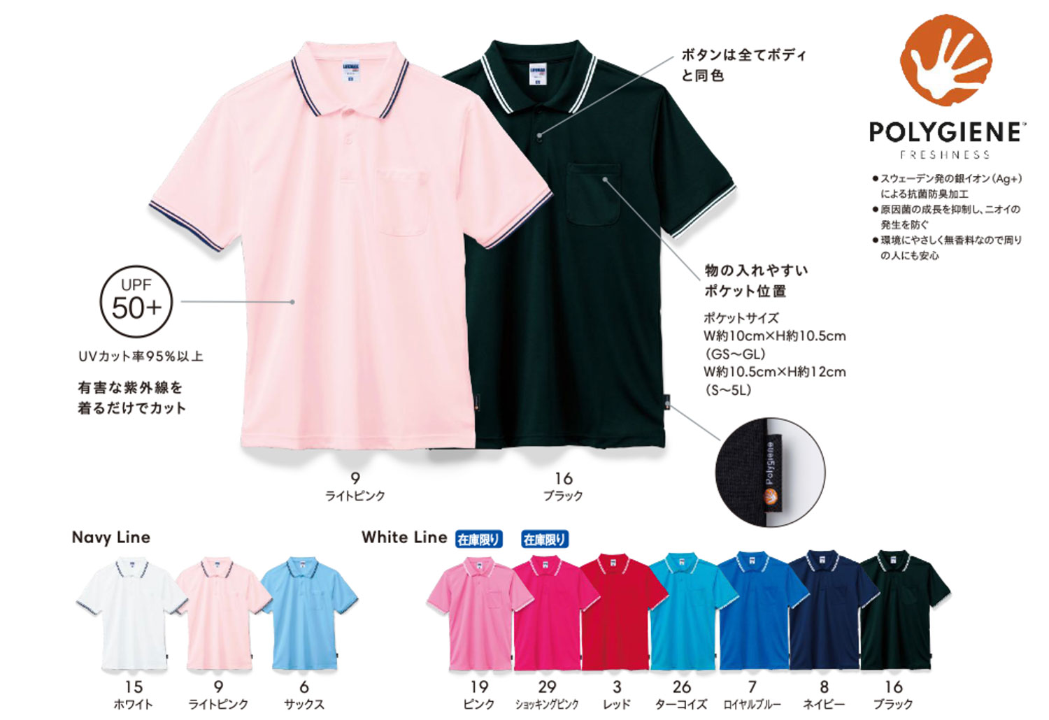 アメリカンベーシック カジュアルウェアブランド【LIFEMAX】ライフマックス。 高機能ドライ素材に、ポリジン加工を施した抗菌防臭の優れたポロシャツ。 ポリジン加工:スウェーデン発の銀イオン(Ag+)による抗菌防臭加工 ・原因菌の成長を抑制し、ニオイの発生を防ぐ ・有効成分の塩化銀はリサイクルされた銀を使用 ・環境に優しく無香料なので周りの人にも安心 衿はリブ仕様。ライン切り替えがアクセント。 ユニフォームとしてもオススメ。 サイズもウイメンズサイズから5Lサイズの幅広い展開。 【ドライウェア プリントに関して】 ブリード現象:ドライ生地へのプリントの場合、プリント時の熱乾燥によりボディ染料が浮き上がり、インクと反応しインクの色が多少変わってしまう事がございます。 極力不具合が生じない様努めておりますが、上記ご容赦下さる様お願い致します。 ※ボディカラーアソートOKです。 |