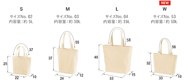 | サイズ | S | M | L | W | | 横幅 | 32 | 36 | 48 | 43 | | 高さ | 25 | 37 | 40 | 32 | | 容量(L) | 5 | 10 | 15 | 10 |